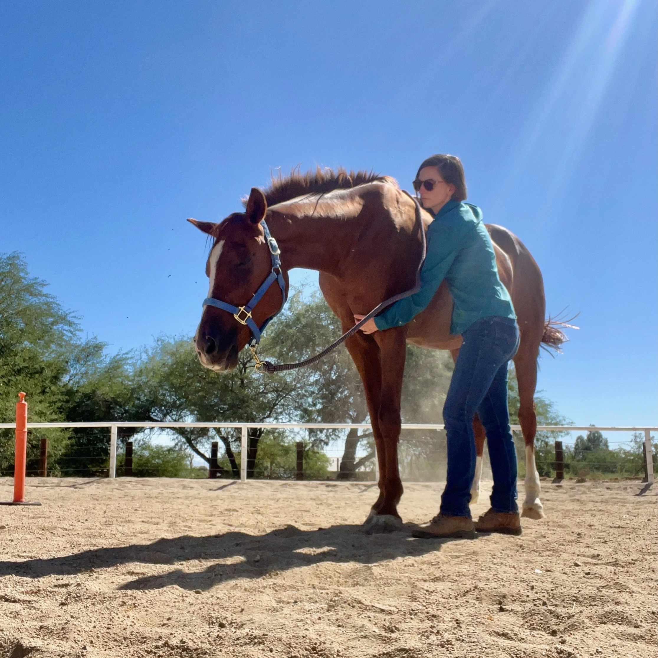 On the day of the session I like to find a place your equine feels most comfortable. Often their own paddock or a quiet round pen works well.